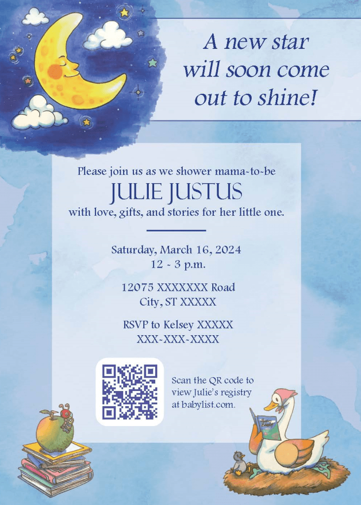 In addition to shower invitations, I also created book plates used in each gifted children’s book, and a commemorative bookmark for guests to take home. These were created to coordinate with the nursery rather than the children’s book theme used in the shower.